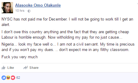 A female NYSC member, Alasooke Omo Olakunle has slammed the scheme for her unpaid December allowance, saying she will not to go to work until she is paid.