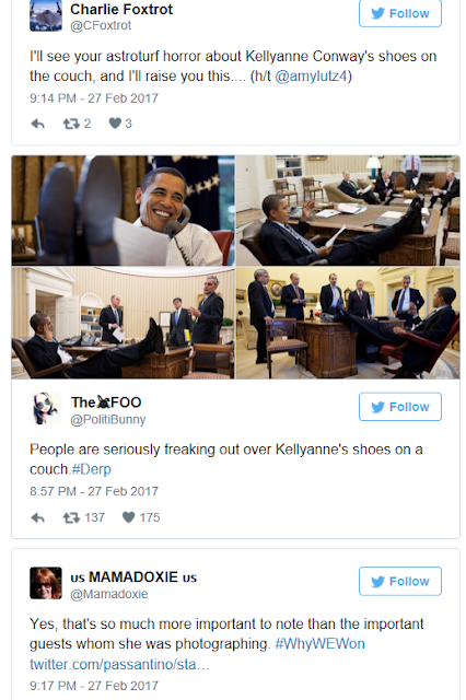 The photo of KelleAnne Conway, who is President Trump’s senior adviser, which showed her sitting on the oval office couch with her shoes as black college presidents visited the white house, has sparked controversy online.